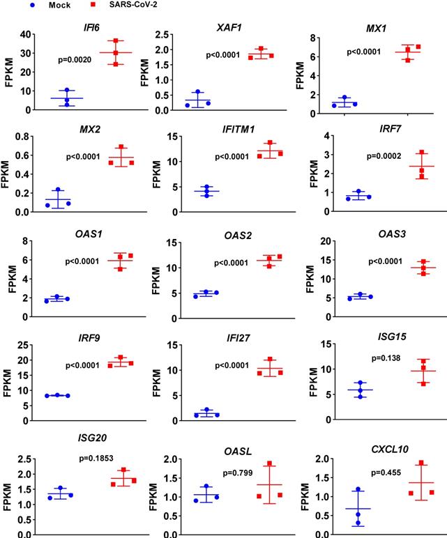 Expression levels of a subset of ISGs in response to SARS-CoV-2 infection in primary human bronchial epithelial cells. Levels of the innate antiviral factors IFI6, XAF1, MX1, MX2, IFITM1, IRF7, OAS1, OAS2, OAS3, IRF9, IFI27, ISG15, ISG20, OASL and CXCL10 in SARS-CoV-2- and mock-infected NHBE cells are presented as FPKM values.