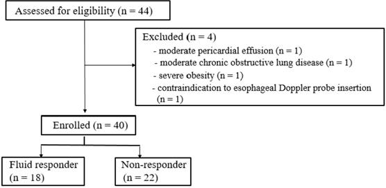 In our study, 44 patients were assessed for recruitment. Four patients met our exclusion criteria (moderate pericardial effusion, moderate chronic obstructive lung disease, severe obesity, contraindication of esophageal Doppler probe insertion), and 40 patients were analyzed (Fig. 1). 18 patients of 40 patients were responders to fluid loading and 22 patients were non-responders. There were no significant differences in the demographic and perioperative data between the responders and the non-responders except operation time and anesthesia time (Table 1).