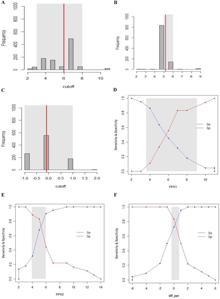 Gray zone analysis of PPV1, PPV2 and ΔPPV. The gray zone analysis depicted two cut-offs between which the diagnosis of fluid responsiveness was uncertain. The optimal threshold of 1,000 resampled population is shown by histograms and the gray zone (95% CI for the optimal cut-off) is represented as a gray shaded area (A, B and C). Using the alternative approach of splitting the ROC curve, the two curves (Se; sensitivity, red, solid line), (Sp; specificity, blue, dotted line) were retrieved (D, E and F). The inconclusive zone, which is more than 10% of diagnosis tolerance, is represented as a gray shaded area.