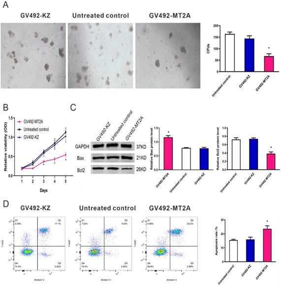 To evaluate the function of MT2A in HL60 cells, we up-regulated its endogenous expression by infection of GV492-MT2A. The results demonstrated that the number and size of clones in the GV492-MT2A group were reduced compared with the GV492-KZ and negative control group (P < 0.05, Figure 4A). The CCK-8 assay demonstrated no significant difference in HL60 cell proliferation between the GV492-KZ and the negative control group (P >0.05). But the proliferation level of HL60 cells in the GV492-MT2A group was prominently lower than that in the GV492-KZ and the untreated control group (P < 0.05, Figure 4B). Also, our findings showed that over-expression of MT2A could induce HL60 cell apoptosis by increasing Bax and inhibiting Bcl2 expression (P < 0.05, Figure 4C). Besides, compared with the control group, there was a significant increase in the number of apoptotic cells, suggesting that MT2A could induce the apoptosis rate of leukemia cells and reduce the cell survival rate, which is consistent with the results of CCK-8 and colony formation assay (Figure 4D).