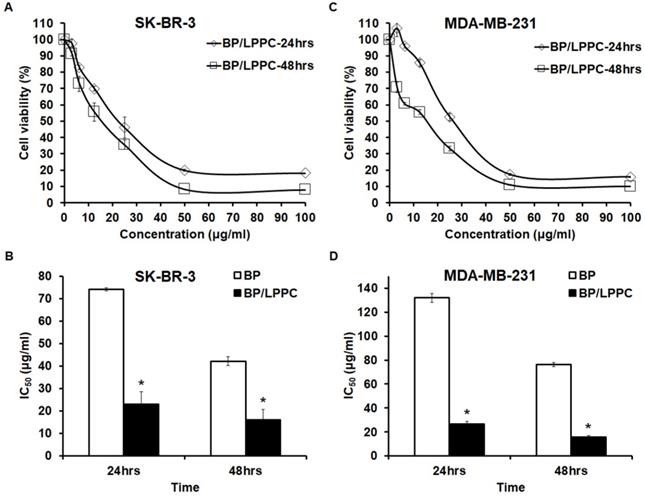 LPPC encapsulation improved the anti-proliferative ability of BP in breast cancer cell lines. SK-BR-3 and MDA-MB-231 cells were separately exposed to BP/LPPC (0-100 µg/ml) for 24 and 48 hrs. After that, an MTT assay was performed to calculate cell viability; absorbance was measured at 550 nm. (A, B) SK-BR-3 cells; (C, D) MDA-MB-231 cells. *: Indicated a significant difference between the IC50 of BP and the IC50 of BP/LPPC (P < 0.05).