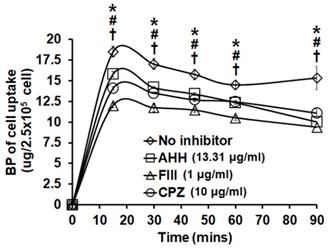 LPPC encapsulation induced breast cancer cell activation of cell endocytic pathways. Cells (2.5×105) were pretreated with inhibitors (AHH, FIII and CPZ) for 1 hr. The inhibitors were discarded and cells were exposed to BP/LPPC (50 µg/ml) for the indicated time points, then BP was extracted from phenol-chloroform, followed by detection with absorbance at 350 nm. *, #, †: Indicated a significant difference compared to AHH (*), FIII (#), and CPZ (†) treatment, respectively, with no inhibitors (P < 0.05).