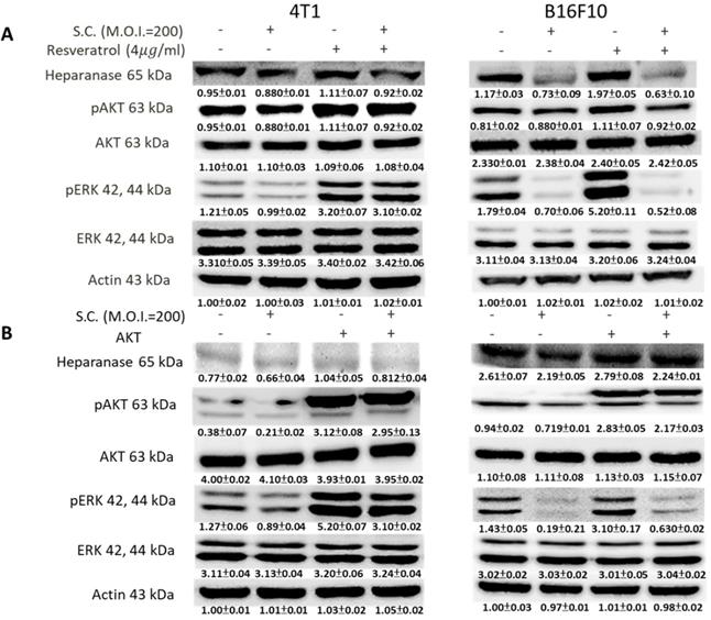 The ERK and AKT signaling pathways were participated in Salmonella (S.C.)-mediated HPSE expression. (A) The 4T1 and B16F10 cells were infected with Salmonella (MOI = 200) at the concentration of 5 µg/mL for 2 h with resveratrol. The protein expression in 4T1 and B16F10 cells was measured. (B) The 4T1 and B16F10 cells were transfected with an active AKT plasmid. The cells were treated with Salmonella (MOI = 200) for 1.5 h after 16 h. The various protein expressions in 4T1 and B16F10 cells was measured. The immunoblotting assay was repeated three times with similar results. Inserted values indicated relative proteins expression in comparison with β-actin.
