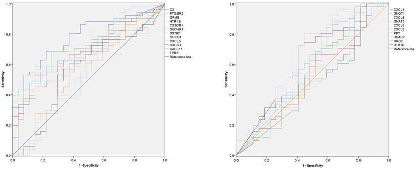 The diagnostic value of 22 hub-genes in distinguishing the death and survival groups, the ROC curve found that nine hub-genes (C3, CXCL5, CX3CR1, GRM8, HCAR2, HTR1B, SUCNR1, PTGER3 and SSTR1) could be used to distinguish the death and survival groups (the p-value for each gene in Table 3).