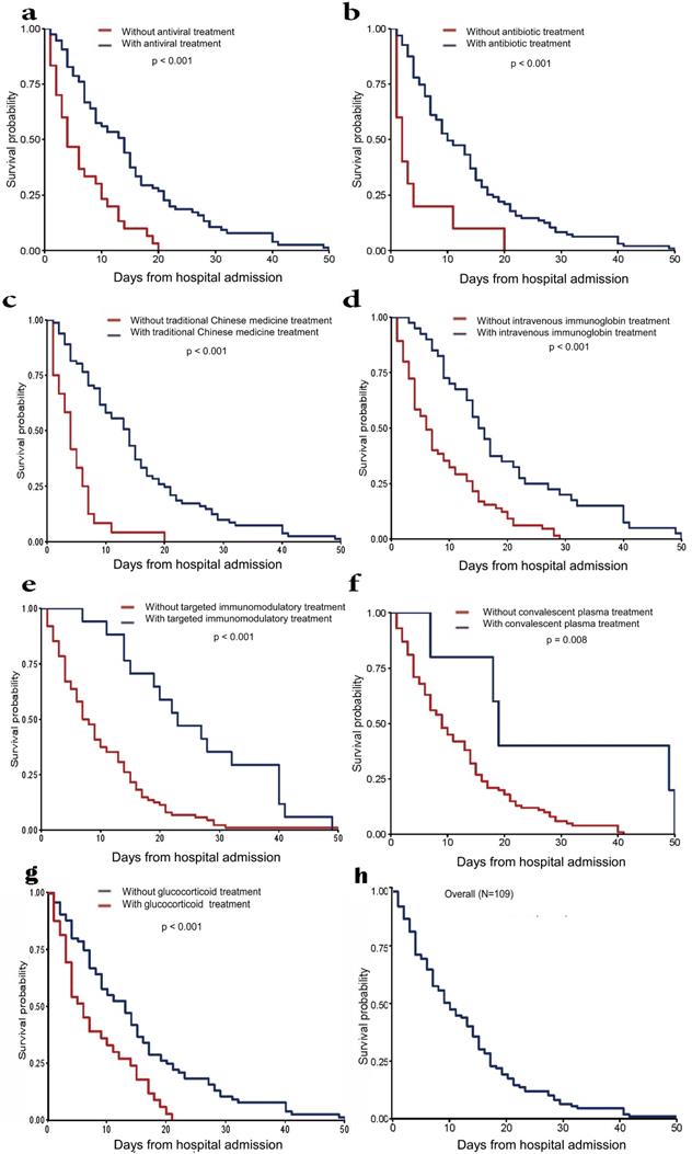 Survival time from hospital admission to death in deceased patients. (a) Patients treated with antibiotics treatment vs. patients treated without antibiotics treatment. (b) Patients treated with antiviral treatment vs. patients treated without antiviral treatment. (c) Patients treated with traditional Chinese medicines treatment vs. patients treated without traditional Chinese medicines treatment. (d) Patients treated with intravenous immunoglobin treatment vs. patients treated without intravenous immunoglobin treatment. (e) Patients treated with targeted immunomodulatory treatment vs. patients treated without targeted immunomodulatory treatment. (f) Patients treated with convalescent plasma treatment vs. patients treated without convalescent plasma treatment. (g) Patients treated with glucocorticoid treatment vs. patients treated without glucocorticoid treatment. (h) Overall survival time of all patients.