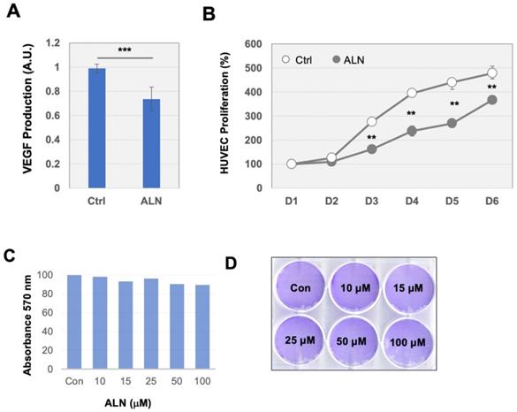 Angiogenic pathways may be upregulated by ALN treatment. (A) Secretion of VEGF in MG-63 bone cells treated with ALN. Effect of ALN treatment on the secreted VEGF levels into conditioned medium by MG-63 cells. Values (mean and standard deviation (SD)) are expressed as fold-changes compared to untreated cells (Ctrl, control). (B) Proliferation of HUVEC in the collected media of MG-63 cells. **p < 0.001, compared to control (Student's t-test). (C-D) No apoptosis was observed within the treatment period of 6 h. (C). Cell viability of MG-63 cells. MTT assay revealed no viability changes by ALN treatment. (D) Crystal violet staining assay showed no cell mass changes in response to varying concentration of ALN for 6 days. Experiments were done 6 times. Representative images were shown.