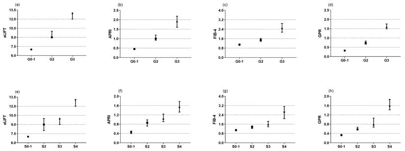 Medians in subgroups classified by inflammation grades and fibrosis stages (Scheuer scoring system). (a) the medians of eLIFT in G0-1, G2, and G3; (b) the medians of APRI in G0-1, G2, and G3; (c) the medians of FIB-4 in G0-1, G2, and G3; (d) the medians of GRP in G0-1, G2, and G3; (e) the medians of eLIFT in S0-1, S2, S3, and S4; (f) the medians of APRI in S0-1, S2, S3, and S4; (g) the medians of FIB-4 in S0-1, S2, S3, and S4; (h) the medians of GPR in S0-1, S2, S3, and S4.