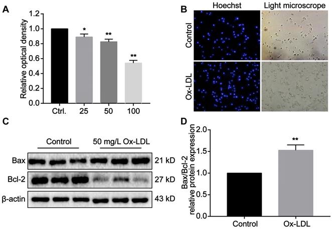 The cytotoxic effect of Ox-LDL in macrophages induces foaming and apoptosis of macrophages. (A) Ox-LDL affects the proliferation of macrophages in a concentration-dependent manner. The control group is set as 1. (B) Representative images of foaming changes after macrophages phagocytosis Ox-LDL (200X). (C-D) The protein expression of Bax and Bcl-2 in macrophage of study groups using Western blot analyses. The control group is set as 1. Data are presented as mean ± SD. *P<0.05 and **P<0.01 vs. Control group.