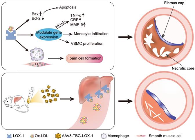 Conclusions: Due to the destruction of endothelial barrier in advanced plaques, rapid deposition of Ox-LDL can result in fast plaque progression, increased necrotic cores, and decreased stability. Our research shows that the use of AAV8 through gene editing allows the liver to express LOX-1 receptors that are more sensitive to Ox-LDL, so that it can continue to bind Ox-LDL in the circulation and exploit the liver's strong lipid metabolism ability to physiologically clear Ox-LDL, which can inhibit the rapid progress of advanced plaque and increase the stability of plaque.