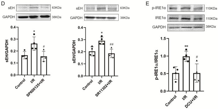 Results: I/R decreased LVSP (105.5±6.4 vs. 146.9±13.4 mmHg), and increased LVEDP (71.4±3.0 vs. 6.0±2.7 mmHg), with a resultant decreased LVDP (34.1±9.2 vs. 140.9±13.1 mmHg). I/R attenuated +dp/dtmax (651.7±142.1 vs. 2806.6±480.6 mmHg/s) and -dp/dtmax (-580.0±109.6 vs. -2118.0±244.9 mmHg/s) (all ps<0.001). The I/R-induced cardiac dysfunction could be alleviated by 4-PBA (LVSP 119.5±15.6 mmHg, p<0.01; LVEDP 21.2±4.2 mmHg, LVDP 98.3±12.0 mmHg, +dp/dtmax 2166.7±208.4 mmHg/s, and -dp/dtmax -1350.9±99.8 mmHg/s, all ps<0.001), GSK2850163 (LVSP 113.4±10.9 mmHg, p<0.01; LVEDP 37.1±3.1 mmHg, LVDP 76.3±13.9 mmHg, +dp/dtmax 1586.5±263.3 mmHg/s, -dp/dtmax -1127.7±159.9 mmHg/s, all ps<0.001), SP600125 (LVSP 113.9±5.6 mmHg, LVDP 40.5±3.3 mmHg, +dp/dtmax 970.1±89.8 mmHg/s, all ps<0.01), SR11302 (LVSP 97.9±7.5 mmHg, p<0.01; LVEDP 52.7±8.6mmHg, p<0.001; LVDP 45.2±9.8mmHg, p<0.05; +dp/dtmax 1231.5±196.6 mmHg/s, p<0.01; -dp/dtmax -658.3±68.9 mmHg/s, p<0.05), or DCU (LVSP 109.9±4.1 mmHg, p<0.01; LVEDP 11.7±1.8 mmHg, LVDP 98.2±4.9 mmHg, +dp/dtmax 1869.8±121.9 mmHg/s, and -dp/dtmax -1492.3±30.8 mmHg/s, all ps<0.001). The relaxant response of the coronary artery to acetylcholine was decreased after I/R in terms of both magnitude and sensitivity (p<0.001). All inhibitors improved acetylcholine-induced relaxation. Global I/R increased sEH expression and induced ER stress in both myocardium and coronary artery. Inhibition of ER stress or IRE1α downregulated I/R-induced sEH expression and inhibited JNK and c-Jun phosphorylation. Both JNK and AP-1 inhibitors lowered sEH level in myocardium and coronary artery in I/R-injured hearts.