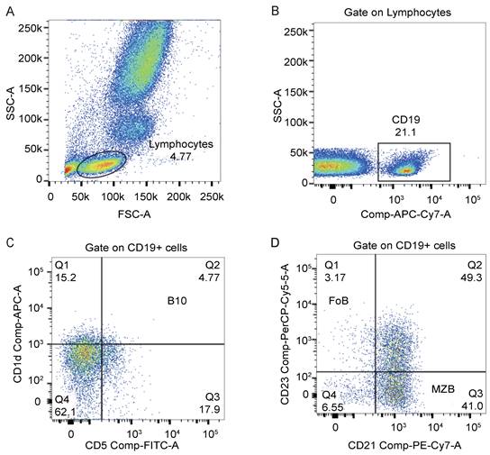 Flow cytometry analysis of the percentage of B lymphocyte subsets in peripheral blood. (A) Lymphocytes were defined on the FSC-A/SSC-A gate. (B) CD19+ cells were gated on lymphocytes. (C) The dot plot represented the gating strategy on B10 cells derived from CD19+ cells. (D) The dot plot represented the gating strategy on MZB cells and FoB cells derived from CD19+ cells.