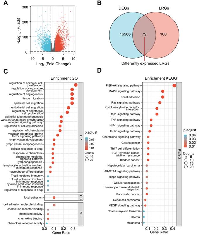 Selection of differentially expressed LRGs and functional enrichment analysis. (A) Volcano map showing the DEGs in the TCGA database (tumor vs. normal). (B) Venn gram showing 79 differentially expressed LRGs. (C, D) Bubble map of significantly enriched GO terms (A) and KEGG pathways (B) in the TCGA dataset. LRGs, lymphangiogenesis-related genes; DEGs, differentially expressed genes.