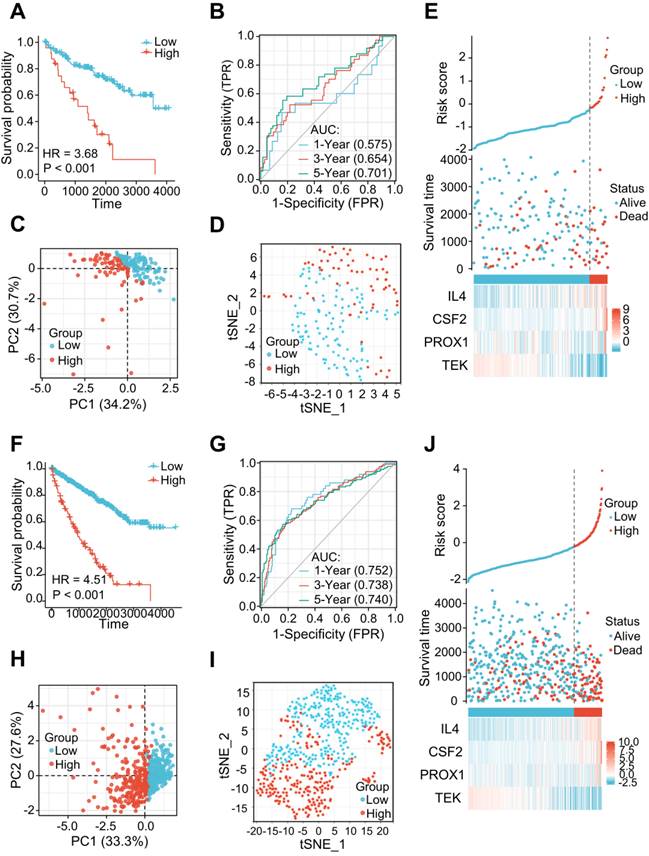 Among the 79 differentially expressed LRGs, 40 LRGs were identified by a univariate Cox analysis in the train cohort of TCGA dataset (n=353) (Figure S1). There were 12 genes identified by a LASSO analysis using the minimum lambda value (Figure 3A and B). Figure 3C shows the correlation among these 12 genes. The multivariate Cox analysis of these 12 genes revealed 4 significantly prognostic genes, including interleukin-4 (IL-4), colony stimulating factor 2 (CSF2), prospero homeobox 1 (PROX1), and TEK receptor Tyrosine Kinase (TEK). (Figure 3D, P < 0.05). Figure S2 shows the differential levels of expression of these 4 genes between ccRCC and normal tissue. These 4 genes could be further classified into protective (TEK) and risky genes (IL4, CSF2, and PROX1) according to the hazard ratio (HR) (Figure 3D). Risk score = (1.84447 × IL4 expression) + (0.83394 × CSF2 expression) + (0.32870 × PROX1 expression) + (-0.35554 × TEK expression). The sample was then divided into low-risk and high-risk groups in accordance with the optimal cut-off point (-0.22103). A Kaplan-Meier survival analysis indicated a shorter OS in the high-risk group (HR = 4.81 [2.97-7.78], P < 0.001) (Figure 3E). The AUCs indicated good predictive capability of the risk scores in terms of OS rates at 1, 3, and 5 years (0.823, 0.780, and 0.751) (Figure 3F). The PCA and t-SNE maps showed a distinct dimension among different groups (Figures 3G and H). Risk map of the risk score distribution, survival status and expression landscape showed that the survival status was strongly related to the risk score (Figures 3I).