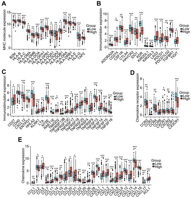 Correlation analysis of the LRG signature and immunoregulatory genes. Box plots displaying the immunomodulatory genes exhibiting significantly different expression between the high-risk and low-risk groups, including (A) MHC genes, (B) immunosuppressive genes, (C) immune activation genes, (D) chemokine receptors, and (E) chemokines. LRG, lymphangiogenesis-related gene; MHC, major histocompatibility complex; *P < 0.05; **P < 0.01; ***P < 0.001.