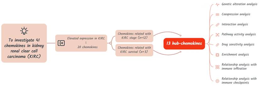 The study design is shown in Figure 1. A total of 41 chemokines were investigated in this study. Firstly, we evaluated the expression of these chemokines in KIRC and identified those with elevated expression levels. Then the hub-chemokines were identified by analyzing the correlation of chemokines and KIRC stage and survival. Lastly, to clarify the role of these hug-chemokines, we further performed the genetic alteration analysis, co-expression analysis, interaction analysis, pathway activity analysis, drug sensitivity analysis, enrichment analysis, as well as the relationship analysis with immune infiltration and immune checkpoints.