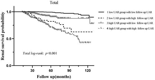 Kaplan-Meier analysis for renal survival grouped by baseline UAR levels and follow up UAR levels.
