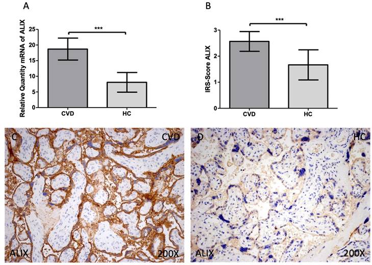 (A). ALIX mRNA expression in the HC group (healthy controls) and CVD patients (chronic venous disease) (B). Protein expression of ALIX based on IRS-Scores in the placenta villi of the HC and CVD group. (C, D). Images showing the immunostaining for ALIX in the placenta villi of the CVD group and the HC group. p < 0.001 (***); p<0.01 (**); p<0.05 (*).