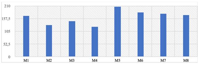 Mono implants exhibited the highest von Mises stress value at 206 MPa (M5 model) and the lowest at 131 MPa (M2 model), whereas dual implants demonstrated a range of 178 MPa (M7 model) to 124 MPa (M4 model). The distinct stress distribution can be attributed to dual implants covering the left and right maxillary bone halves separately, which may enhance load distribution and stress absorption. As a result, the lower stress levels in dual implants could potentially minimize implant failure or bone resorption risks, potentially improving clinical outcomes.