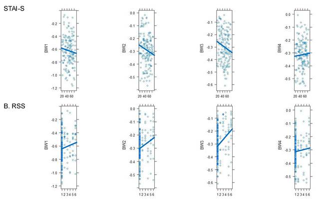 Results: The STAI-S score was significantly correlated with power of bandwidth (p = 0.034). In addition, the RSS score was significantly correlated with BW 1, 2, and 3 (p = 0.010, p < 0.001, and p = 0.003, respectively).