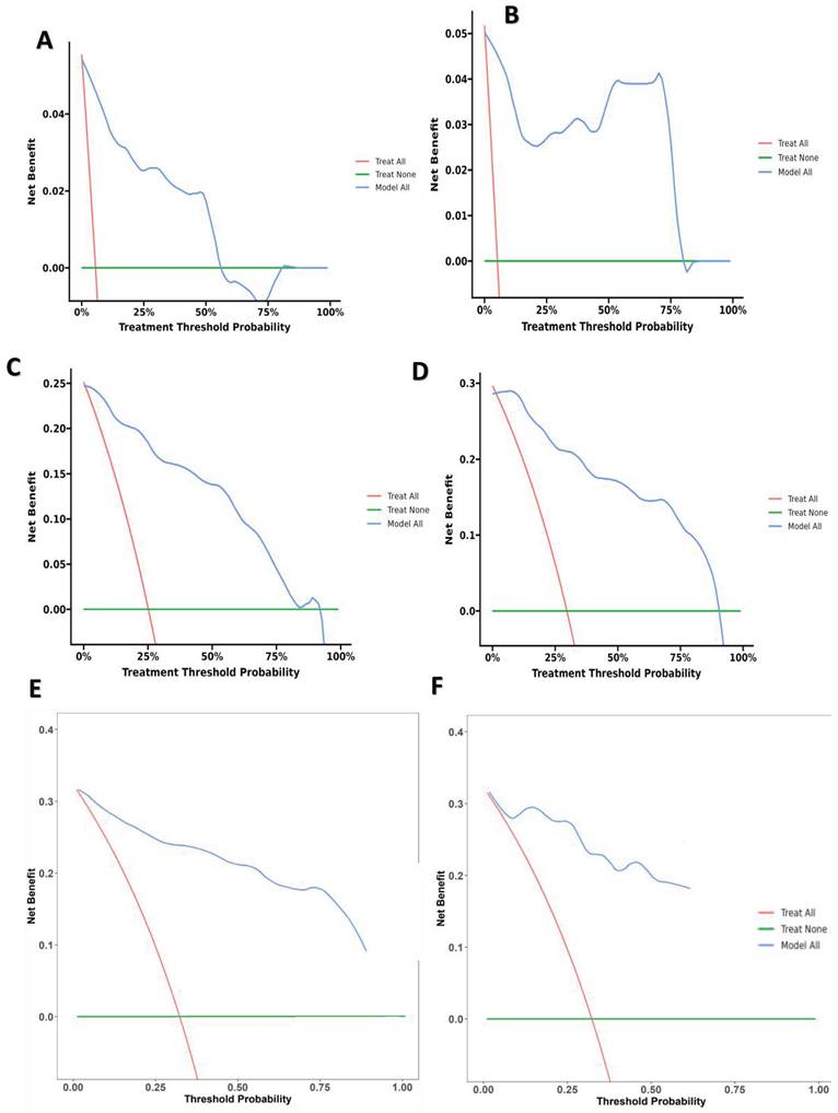 (A) 12-month Decision curve analysis for Development group, (B) 12-month Decision curve analysis for Validation group, (C) 18-month Decision curve analysis for Development group, (D) 18-month Decision curve analysis for Validation group, and E 24-month Decision curve analysis for Development group, 24-month Decision curve analysis for Validation group.