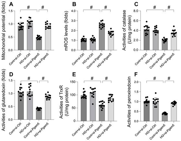 Mitochondrial dysfunction was induced by hyperglycemia due to increased Pgam5. A. JC-1 probe was used to stain mitochondrial membrane potential. B. ROS production was measured in cardiomyocytes. C-F. The activities of catalase, glutaredoxin, thioredoxin reductase (TrxR), and peroxiredoxin were determined by ELISA. #p<0.05.