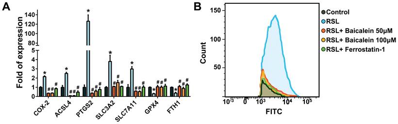 Figure 3A demonstrates that when treated with 0.5 μM RSL3 for 16 h, there was an increase in the expression of ferroptosis-associated genes such as COX-2, ACSL4, PTGS2, SLC3A2, and SLC7A11. Concurrently, there was a reduction in GPX4 and FTH1 levels, which are typically reduced during ferroptosis. Moreover, the addition of 50 and 100 μM baicalein, or 10 μM ferrostatin-1 significantly reduced the over-expression of COX-2 and increased the down-regulated GPX4 and FTH1 levels. Flow cytometry detecting C11-BODIPY revealed that RSL3 treatment increased cell peroxidation, which was significantly reduced by adding 50 and 100 μM baicalein, or 10 μM ferrostatin-1 (Figure 3B).