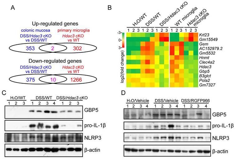 To find the target genes that regulated by HDAC3 in the development, we compared the RNA sequencing results from colonic mucosa and primary microglia. The results revealed that 2 genes were significantly upregulated and 10 genes were significantly downregulated in both the colonic mucosa and the monocytes from the Hdac3 cKO mice (Figure 5A and B). Among the genes, Gbp5 has been previously reported to be upregulated in colonic mucosa, and plays a pro-inflammatory role in the development of colitis by potentiating the activation of NLRP3 inflammasomes [20]. In our study, we found GBP5 was upregulated in DSS/WT group, and was dampened in DSS/Hdac3 cKO group.