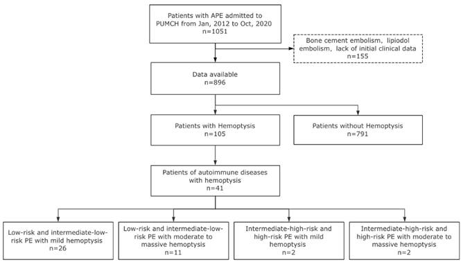Methods: The retrospective study aimed to investigate patients with autoimmune disease who presented with acute PE and hemoptysis at Peking Union Medical College Hospital (PUMCH) between January 2012 and October 2020. A comparative analysis was conducted between patients with and without hemoptysis, as well as between those with autoimmune diseases and those without. Clinical characteristics, PE severity stratification, the amount of hemoptysis, initial anticoagulation management, and prognosis were analyzed descriptively.