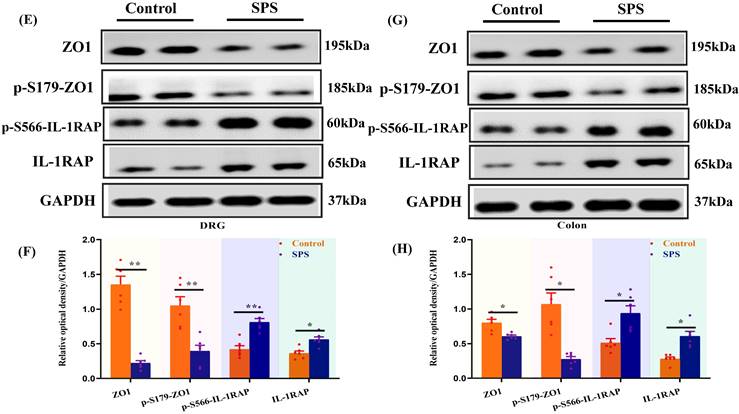 Altered phosphorylation of ZO1 and IL-1RAP was examined by Western blotting. (A) The expression of ZO1, p-S179-ZO1, p-S566-IL-1RAP and IL-1RAP in the hippocampus. (B) The relative optical density of ZO1, p-S179-ZO1, p-S566-IL-1RAP and IL-1RAP expression in the brain of mice following exposure to single-prolonged stress (SPS) as determined by Western blotting. (C) In spinal. (D) The relative optical density of ZO1, p-S179-ZO1, p-S566-IL-1RAP and IL-1RAP expression in the spinal of mice following exposure to SPS as determined by Western blotting. (E) In the dorsal root ganglion (DRG). (F) The relative optical density of ZO1, p-S179-ZO1, p-S566-IL-1RAP and IL-1RAP expression in the DRG of mice following exposure to SPS as determined by Western blotting. (G) In the small intestine. (H) The relative optical density of ZO1, p-S179-ZO1, p-S566-IL-1RAP and IL-1RAP expression in the small intestine of mice following exposure to SPS as determined by Western blotting. (I) In colon. (J) Relative optical density of ZO1, p-S179-ZO1, p-S566-IL-1RAP and IL-1RAP expression in the colon of mice following exposure to SPS as determined by Western blotting. With GAPDH as the loading control. The statistical differences were determined using Two-way ANOVA followed by Sidak's multiple comparison test. **p < 0.005, *p < 0.05 compared with control group.