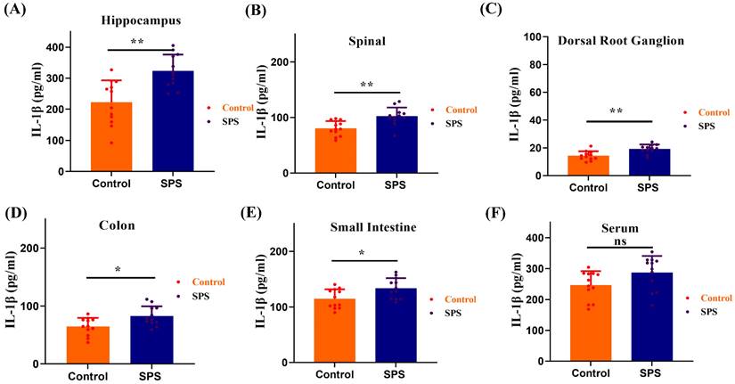 We observed a significant elevation of IL-1β levels in the spinal cord and hippocampus of SPS mice compared to the control group (Figure 7 A,B, p<0.001). Meanwhile, IL-1β levels also increased in the DRG, colon, and small intestine (Figure 7 C,D,E, p < 0.05). However, there was no statistically significant difference in serum IL-1β levels between the SPS and control groups (Figure 7 F, F = 1.361, p = 0.0583). These findings suggest that the inflammatory response in stressed mice predominantly manifests in the gut-vagus nerve-brain pathway of the BGA, and it does not exert its effects through the humoral circulatory regulatory mechanism within the BGA.