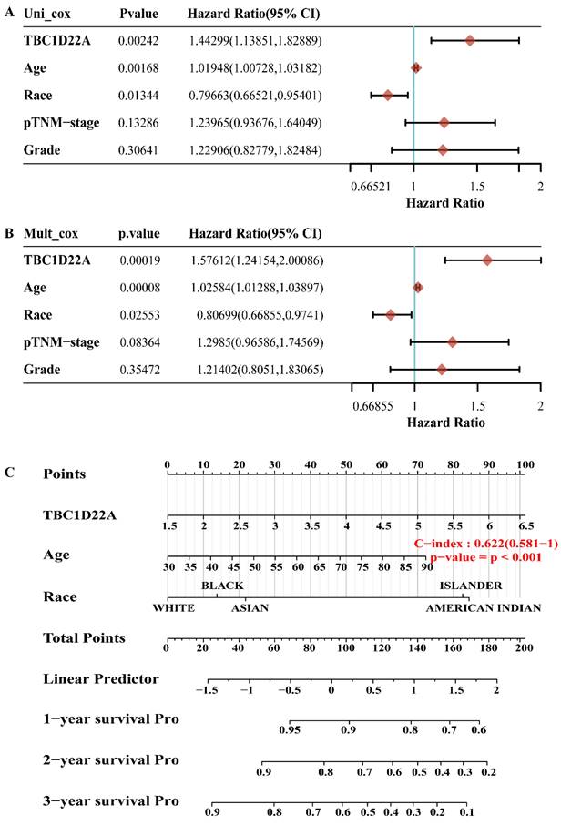 We evaluated the prognostic value of TBC1D22A, race, age, pathological grade, and TNM stage in ovarian cancer using univariate and multivariate Cox regression analyzes. Forest plots were adopted through the "forestplot" package to show p-values, hazard ratio (HR), and 95% confidence interval (CI) for every variable. According to the outcomes of multivariate Cox regression analysis, the 1,2, and 3-year survival rates was predicted by establishing a nomogram with the "rms" package. Providing a graphical result of these factors, the nomogram can be adopted to calculate the prognostic risk for a patient by the points related to each risk factor.