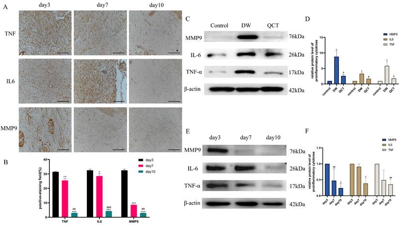 Effects of QCT on pro-inflammatory cytokines at early stages. (A) Immunohistochemical staining of TNF-α, IL6 and MMP9 at days 3, 7 and 10. Scale bar=50μm. (B) Quantitative analysis of TNF-α, IL6 and MMP9. (C) Representative WB images of MMP9, IL6 and TNF-α in different group. (D) Quantitative analysis of MMP9, IL6 and TNF-α in different group. (E) Representative WB images of MMP9, IL6 and TNF-α at days 3, 7 and 10. (F) Quantitative analysis of MMP9, IL6 and TNF-α at days 3, 7 and 10. ***p<0.001 versus day 3, **p<0.01 versus day 3, *p<0.05 versus day 3; ###p<0.001 versus day 7, ##p<0.01 versus day 7, #p<0.05 versus day 7.