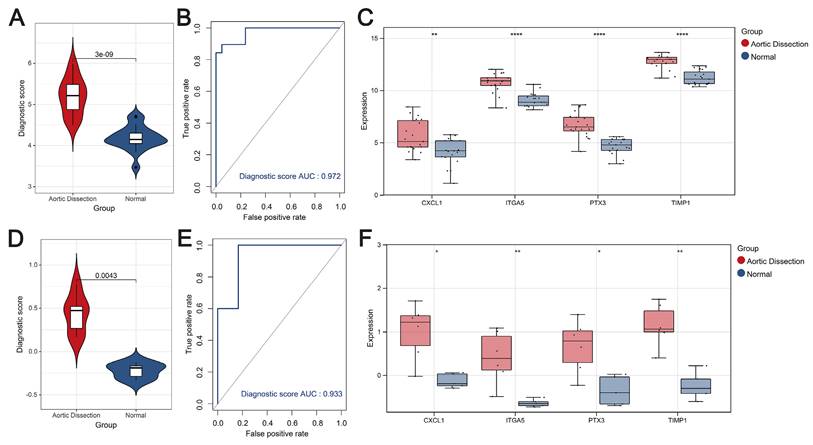 Although the four hub genes showed excellent diagnostic potentials in AD. They were reported to predict other disease. TIMP1 and CXCL1 has been reported to be elevated in colorectal cancer [59]. CXCL1 and PTX elevation has been reported in acute myocardial infarction[60]. PTX3 and TIMP1 was involved in a glioma patients' diagnostic model[61]. However, the above study generated the prediction model combine with other hub genes. The combination of these four genes (CXCL1, TIMP1, ITGA5, and PTX3) has not been reported for disease prediction before, indicating its specificity for aortic dissection diagnosis.