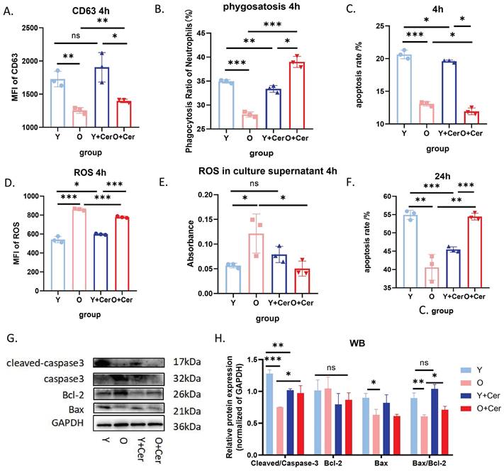 In vitro intervention with ceramide mixture promotes apoptosis and improves biological functions of neutrophils in aged mice. (A) Flow cytometry analysis of CD63 expression on neutrophils treated with ceramide for 4h (and without intervention) (n=3). (B) Flow cytometry analysis of phagocytosis ratio after co-incubation of ceramide-treated (4h) or untreated neutrophils with fluorescent E. coli analogues at 37°C for 2 h (n=3). (C) Flow cytometry analysis of apoptosis levels in neutrophils from aged and young mice cultured with ceramide in vitro for 4h (n=3). (D) Flow cytometry analysis with DCFH-DA staining showing ROS levels after neutrophil culture with ceramide in vitro for 4h (n=3). (E) ROS probe detection of ROS levels in culture supernatants of neutrophils treated with ceramide for 4h (and without treatment) (n=3). (F) Flow cytometry analysis of apoptosis levels in neutrophils from aged and young mice cultured with ceramide in vitro for 24h (n=3). (G-H) Protein abundance of apoptosis-related proteins in neutrophils with representative virtual blot bands (n=3).
