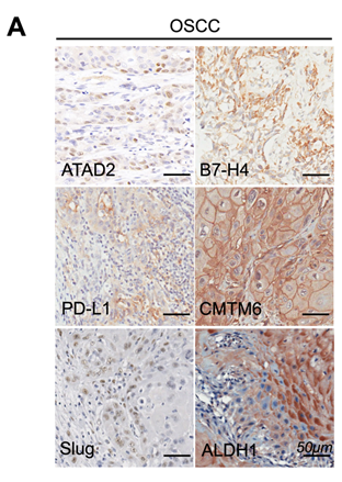 Representative immunohistochemical staining of ATAD2, B7-H4, PD-L1, CMTM6, Slug and ALDH1 in OSCC. Scale bar, 50 µm.